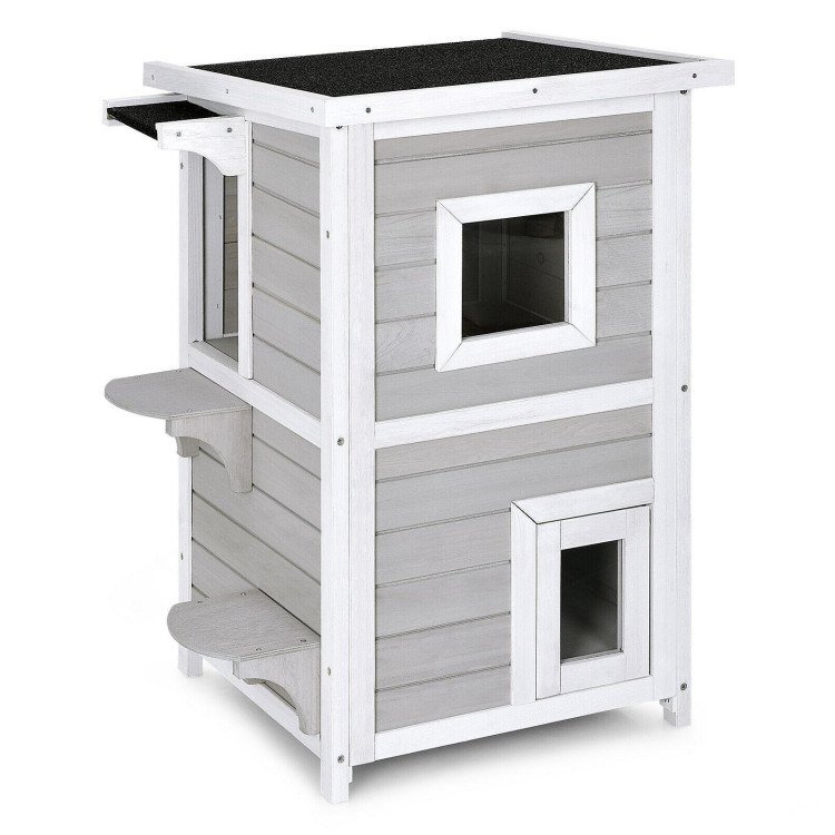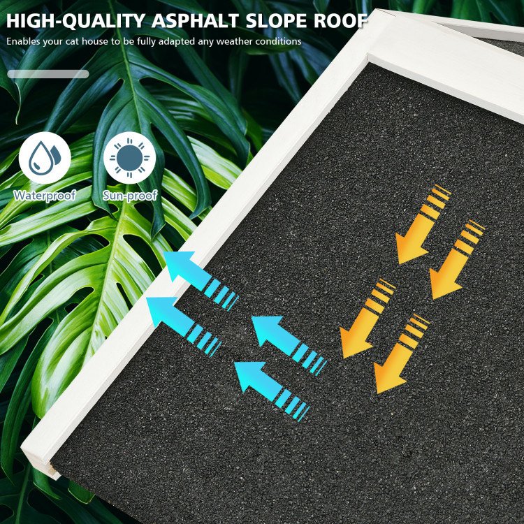 3.Indoor and Outdoor Cat Shelter: This wooden cat condo has an asphalt roof and eave that are water-proof and sun-proof. Therefore, it is adaptable for both domesticated and stray cats indoors and outdoors. The tilted roof also keeps the rainwater from accumulating.