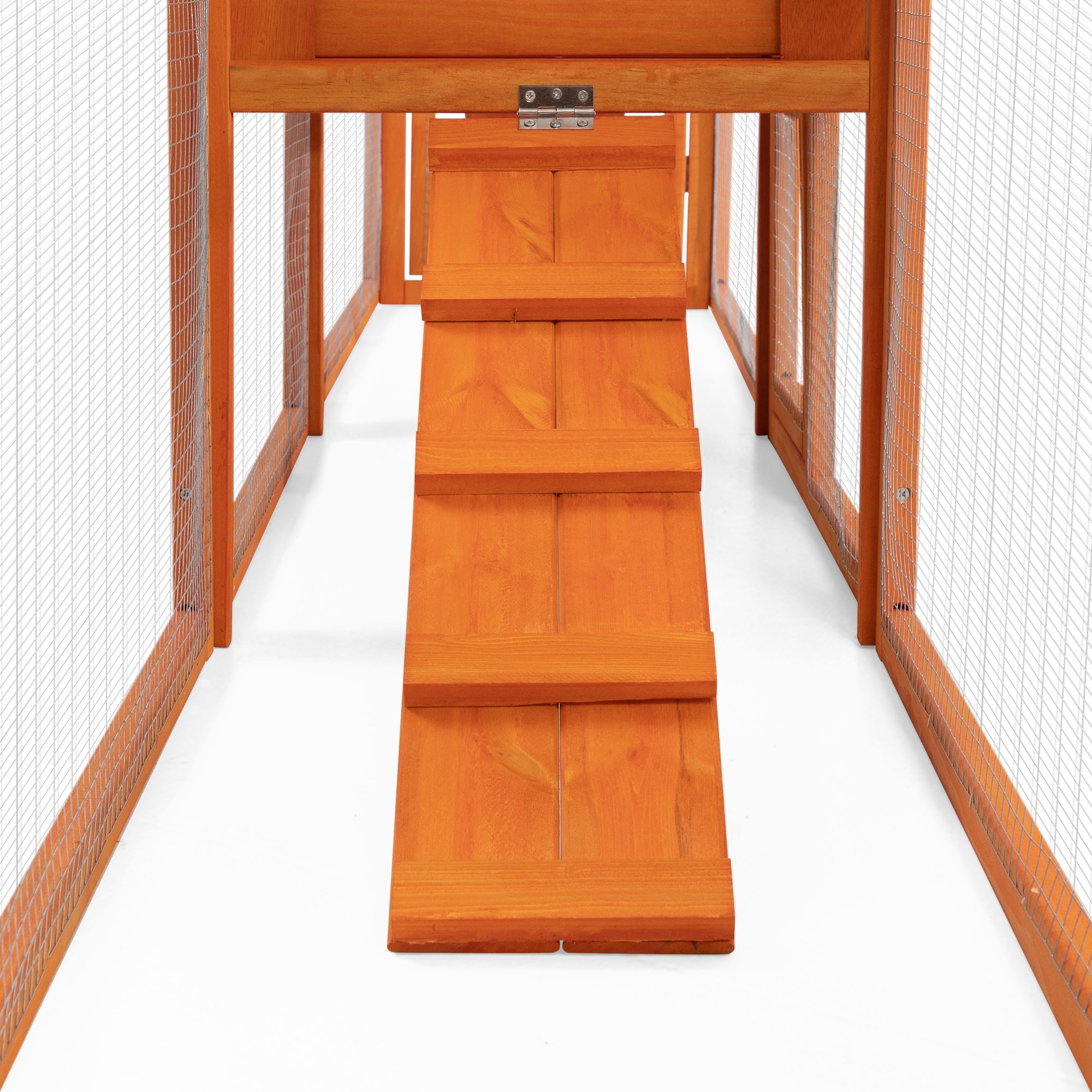 Color: OrangeMaterials: Radiata Pine, Galvanized Wire Mesh, Polycarbonate Sheet, Asphalt SheetCraftsmanship: Hot-dip galvanized iron wire mesh; Paint: Water-based paint (sprayed) in orange colorOverall product dimensions: 240(L) * 48(W) * 79(H) cmThe product is divided into three sections: a central resting area and two identical side enclosures for roaming, which are mirror images of each other.The overall dimensions of each roaming area are: 84 * 43 * 53.5 cm, with the top made of a wooden frame + polycarbonate sheet (0.5 cm thick), flush with the bottom dimensions. Each roaming area has a galvanized wire mesh door on the side that can be opened. There is a staircase in each roaming area connecting to the resting area, with the staircase dimensions being: 13.7 * 57.5 cm.The overall dimensions of the resting area are: 84 * 48 * 79 cm, with the top cover made of wooden slats + asphalt, and the top cover dimensions are 78 * 48 cm. The front of the resting area has two small doors, one above the other, and a drawer in the middle, with the drawer dimensions being: 67.5 * 41 cm.