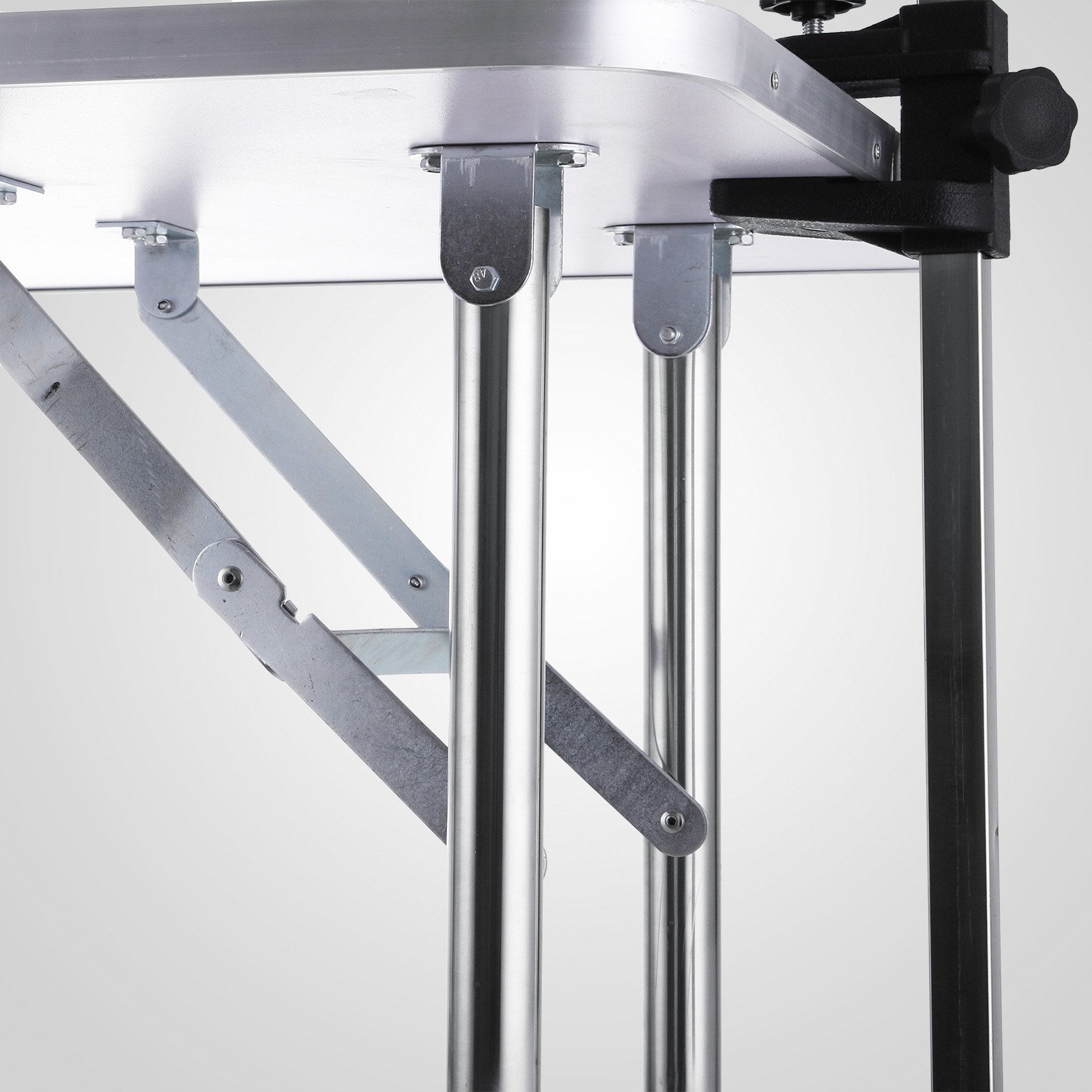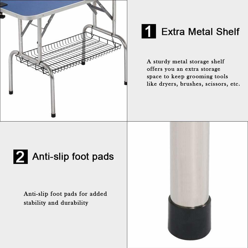  Solid construction and sturdy table. The table is ribbed rubber surfaced which ensures the pets' safety. Rust-resistant stainless steel legs and arms make it durable for use. Static-free board with skid resistance makes it easy to cleaned. The board with Rubber is waterproof and stable,hair and debris can be wiped down easily. Comes with a clamp-on Adjustable Grooming Arm and security nylon Loop. Rounded Aluminium edges for safety purposes. Collapsible and Easy to Assemble for convenient use and storage.
