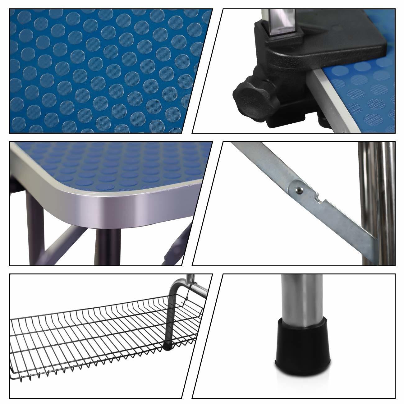 NEW HIGH QUALITY FOLDING PET GROOMING TABLE STAINLESS LEGS AND ARMS BLUE RUBBER TOP STORAGE BASKET