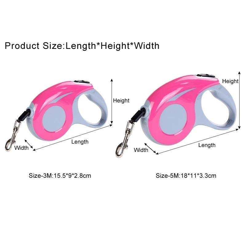 Material: ABS+NylonSize1: 3M=11.5 ft for dogs up to 55 lbsSize2: 5M=16.5 ft for dogs up to 110 lbsColor: Black /Pink/Blue/Package Includes:1 x Automatic Retractable Dog LeashFeatures:1. Perfect for small & medium & big sized dogs.2. Compact, lightweight and easy to handle. Ergonomic non-slip grip is soft and fits nicely into your hand, helping to comfortably maintain a strong grip, even with dogs that are pulling and running.