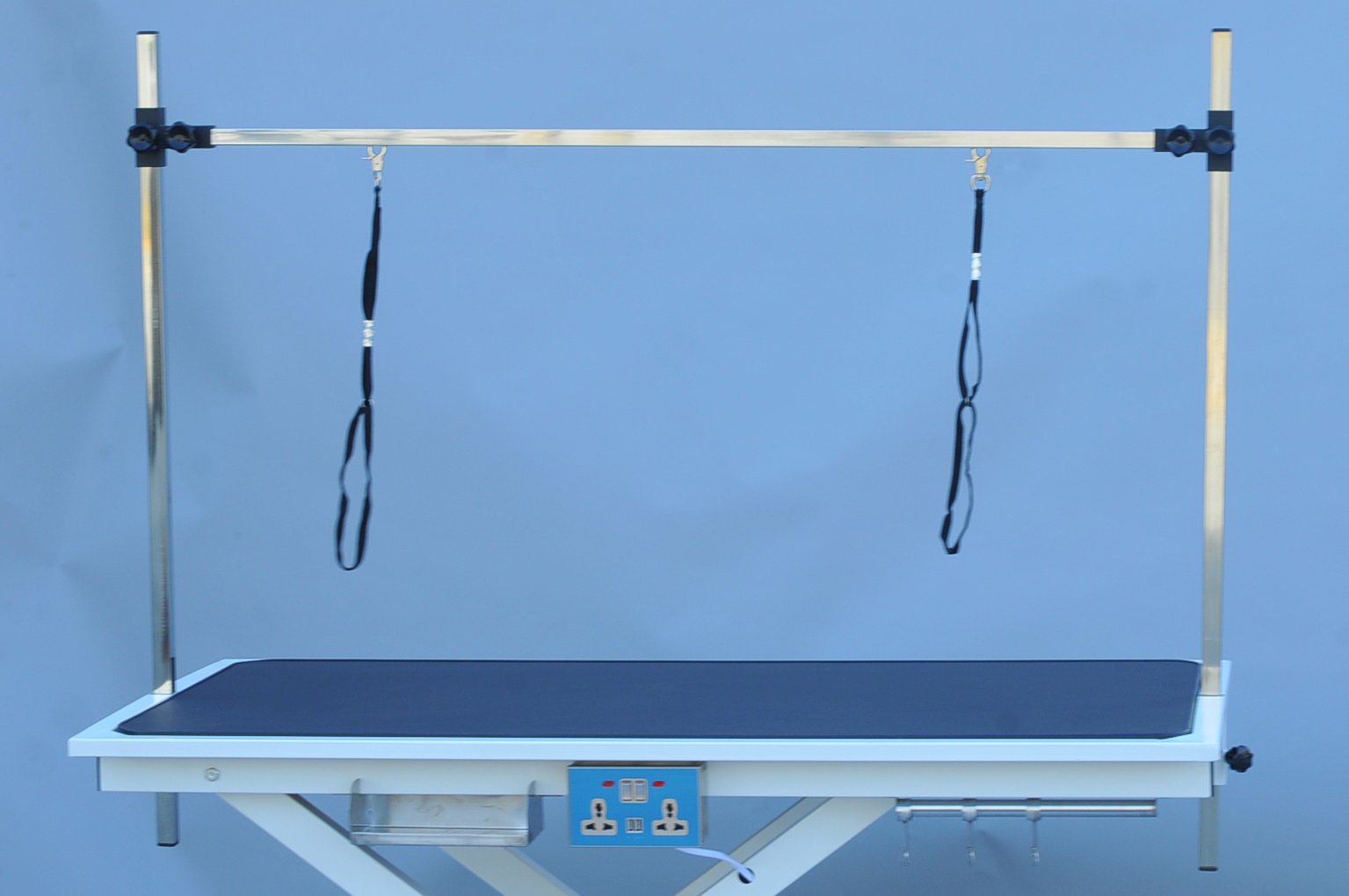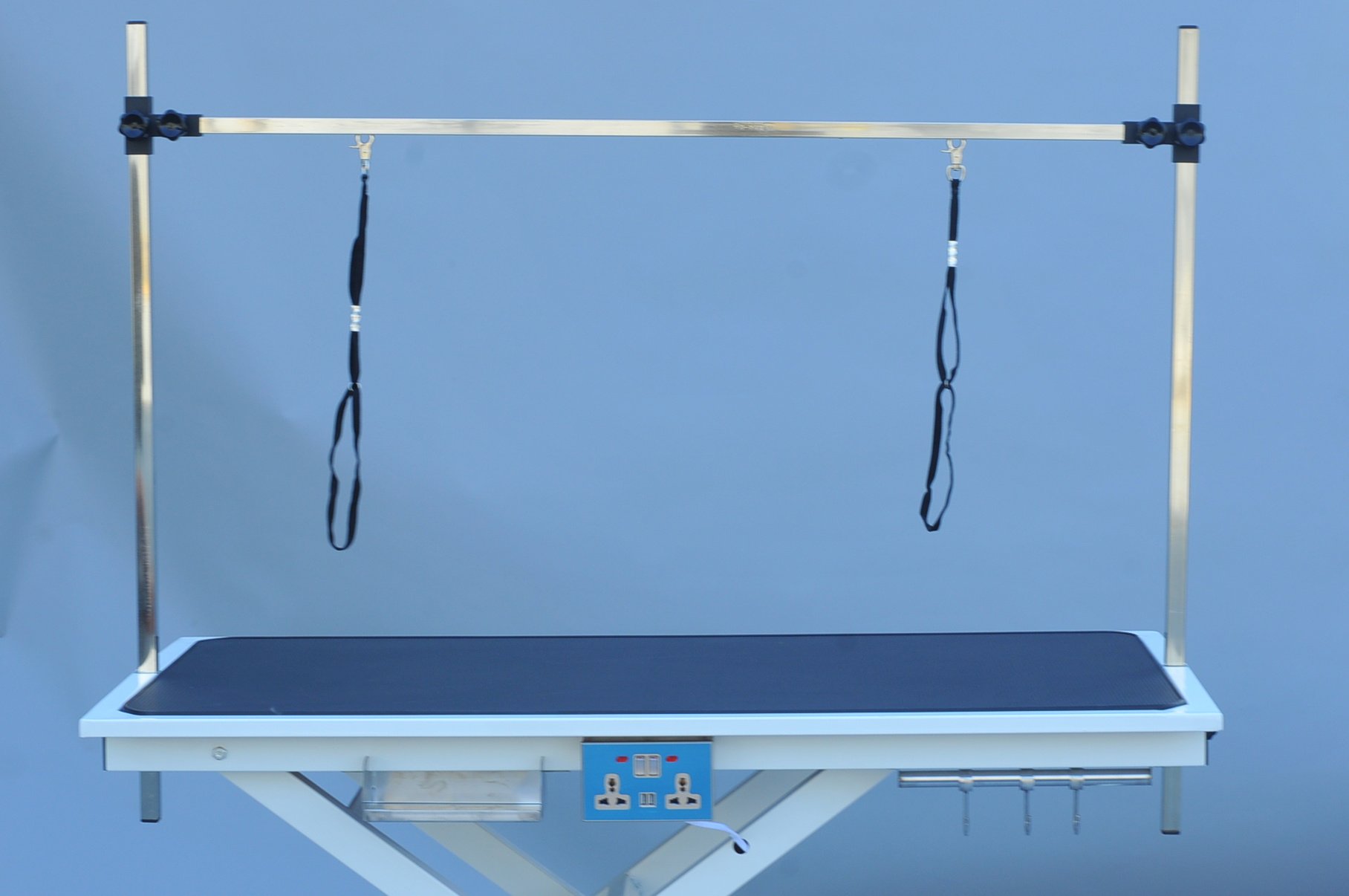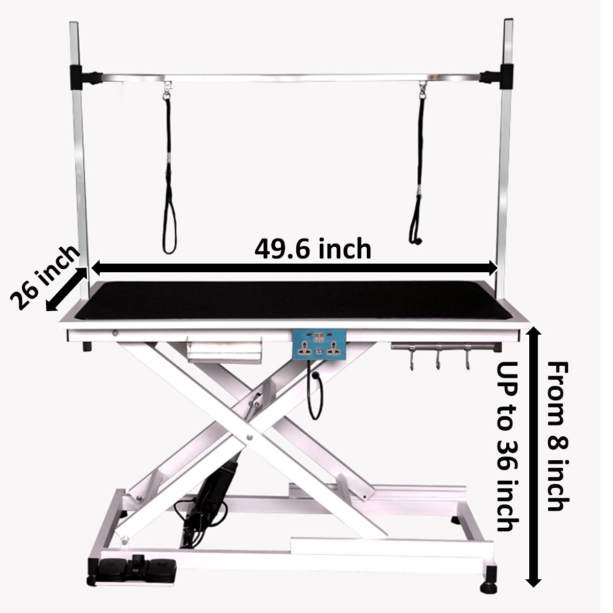 Specifications:Heavy Duty Electric Grooming Table design for professional pet groomer.• Table size: 49.6"X26", height adjustable from 8" up to 36"• Electric Lift X Style to level up makes it stable and you can lifting the table when the pet stand on the table.• heavy duty design help to support 150lbs weight when lifting, and 330 lbs motionless loading.• double arm with double loops to help fixing the pet stand on the table.• the loops Constructed with high quality metal hardware to ensure sturdiness and reliability. the rubber-coated steel-core cable makes it extremely durable, attached cushion rope protecting dog's neck and abdominal area.