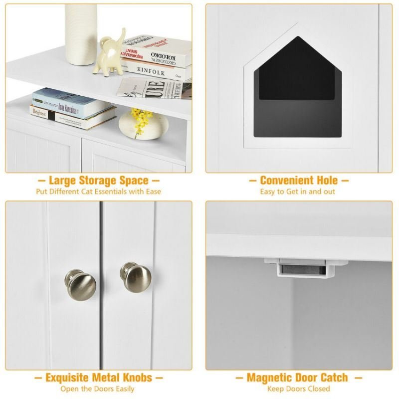 1.Privacy for Your Kitty: Considering your feline friend's privacy, there are 2 doors with magnetic door holders on this cat litter box enclosure to create a space that belongs to your cat. Meanwhile, cats can easily get in and out through 2 cat holes. And it keeps the litter clean instead of being scattered everywhere.